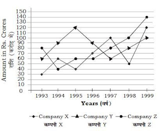 Y and Z together, during various years are: In 1993 = Rs (30 + 80 + 60) crores = Rs 170 Cr In 1994 = Rs (60 + 40 + 90) crores = Rs 190 Cr In 1995 = Rs (40 + 60 + 120) crores = Rs 220 Cr In 1996 = Rs (70 + 60 + 90) crores = Rs 220 Cr In 1997 = Rs (100 + 80 + 60) crores = Rs 240 Cr In 1998 = Rs (50 + 100 + 80) crores = Rs 230 Cr In 1999 = Rs (120 + 140 + 100) crores = Rs 360 Cr Clearly, the total exports of the three companies X, Y and Z together are same during the years 1995 and 1996 |